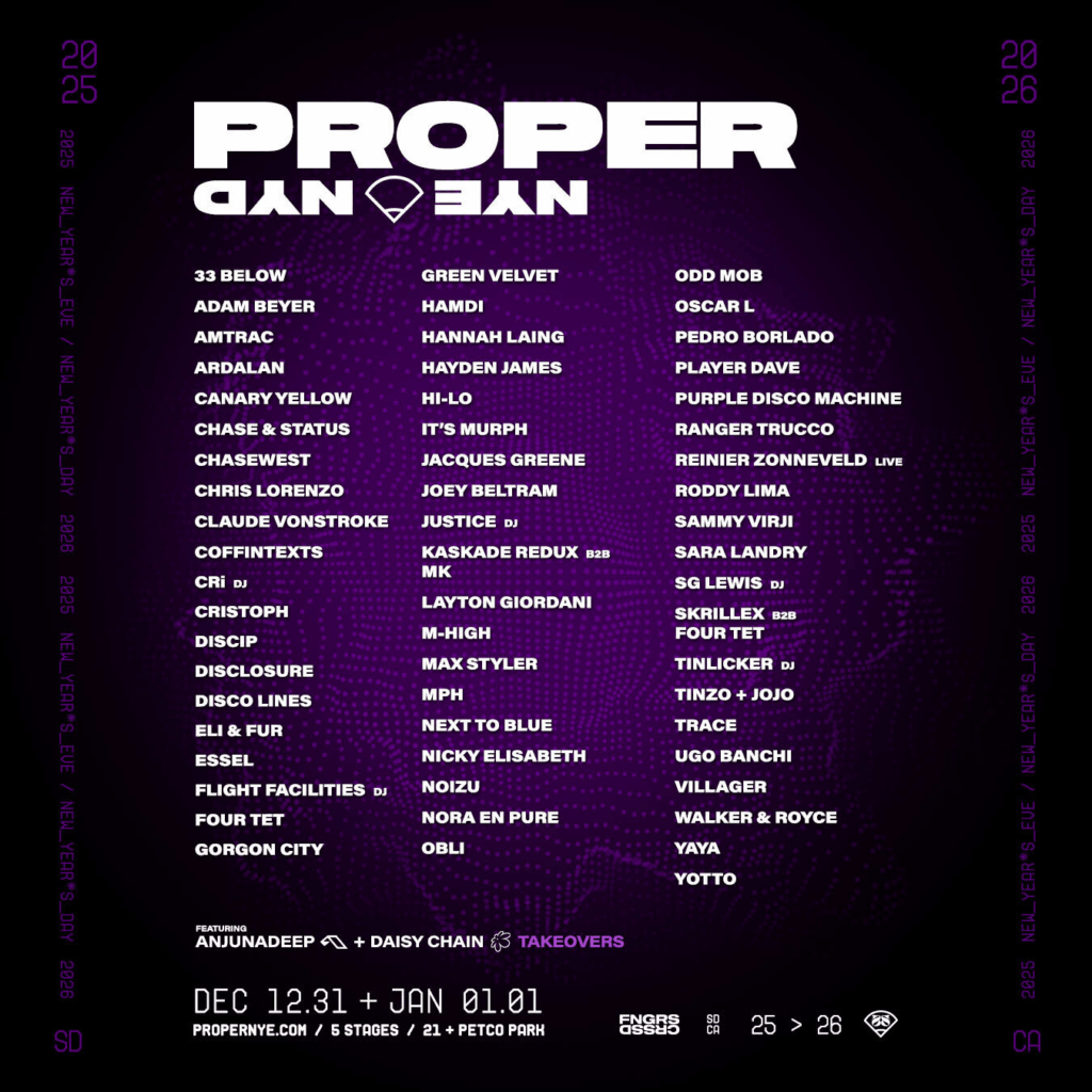 As if the 4th year of PROPER NYE/NYD could be any better, no one could have expected this. The organizers just added some of the most respected heavy hitters to the last 2025 (and first of 2026!) celebration in San Diego, CA. Back in September, we got the first wave of artists for the December 31st and January 1st gracing the stages at Petco Park. And now, FNGRS CRSSD just took it to a whole new level.