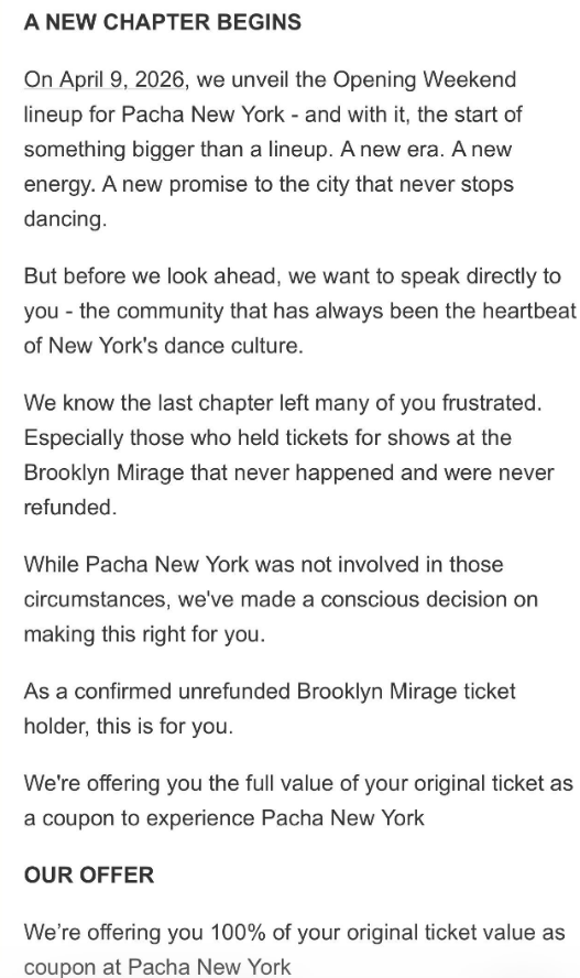 Most recently, Pacha New York is looking to gain momentum in New York City as it navigates this challenging situation and prepares to build a new venue to replace the demolished Brooklyn Mirage. As a goodwill gesture, the company announced that anyone who did not receive a refund for a Brooklyn Mirage ticket can apply 100% of their original ticket value towards: