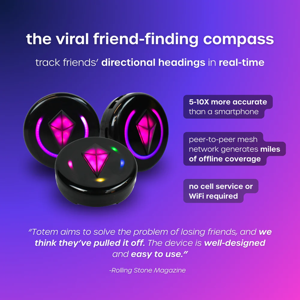The way this device works is that it must be paired with other Totems, with a maximum of 4 additional totems in your crew. Each device is assigned a color, and then each device will track the relative locations of each color. You follow the color on your compass until you reach the other device. In the meantime, when you wear the Totem on your neck, it pulsates and changes colors to the music to make it a cool accessory.