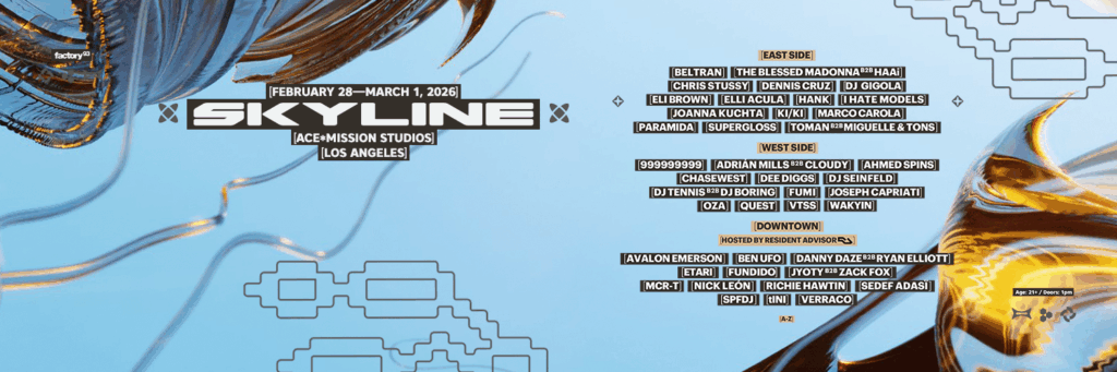 For 2026, Skyline expands with a new Downtown stage hosted by Resident Advisor, joining the returning West Side, East Side, and Arts District stages (Arts District lineup TBA). The move to Ace*Mission Studios allows the festival to introduce a warehouse-style stage environment, blending open-air and industrial spaces. With the added stage, Skyline will feature over 10 hours of music per day and more than 60 artists, plus official afterparties inside the warehouse.